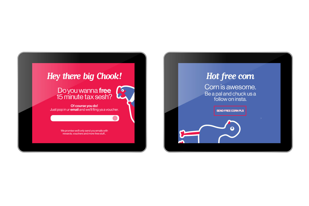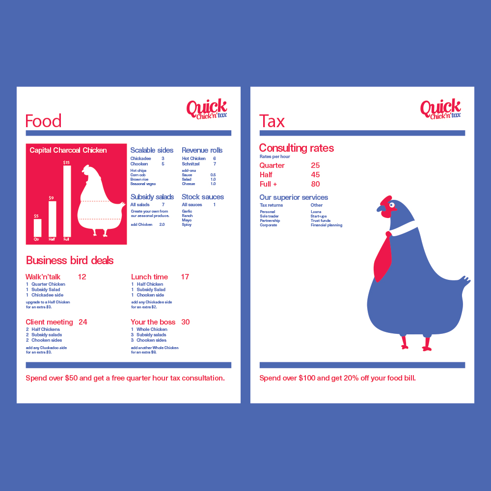 An imaginary billionaire client has tasked me with making a charcoal chicken and tax return combination business work. Two stallwarts of the Aussie shopping strip coming together at last. The project evolved into a service design excercise as tried to figure out how to make this abomination work (and beef out the branding.)